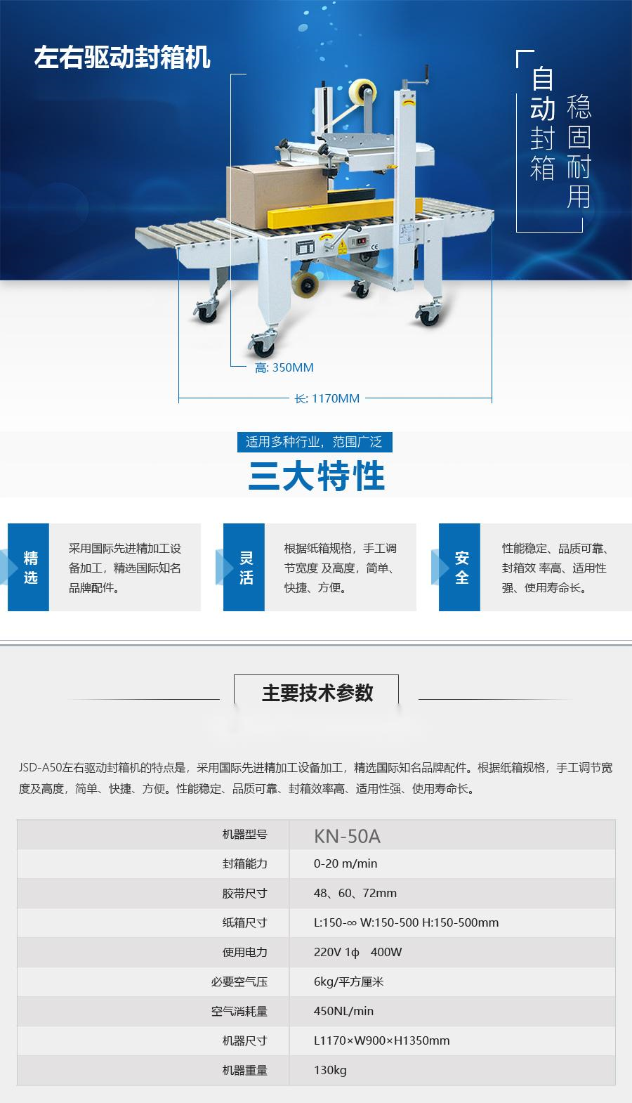 KN-50A全自动折盖封箱机两侧皮带驱动,采用即贴胶带封口,全自动折盖上下速,平稳,且封箱效果平整、规范、美观,可根据纸箱规格,,自动调节宽度与高度,简单,快捷,方便,可替代人工,提高高达80%的生产效率.,节省5-10%耗材,是企业节省成本,提高生产效率,实现包装标准化的好选择。这款全自动折盖封箱机又称为自适应全自动封箱机,根据纸箱尺寸大小自动调整,如需要手动调整纸箱大小尺寸,建议选用手工折盖封箱机(手动调整)。
